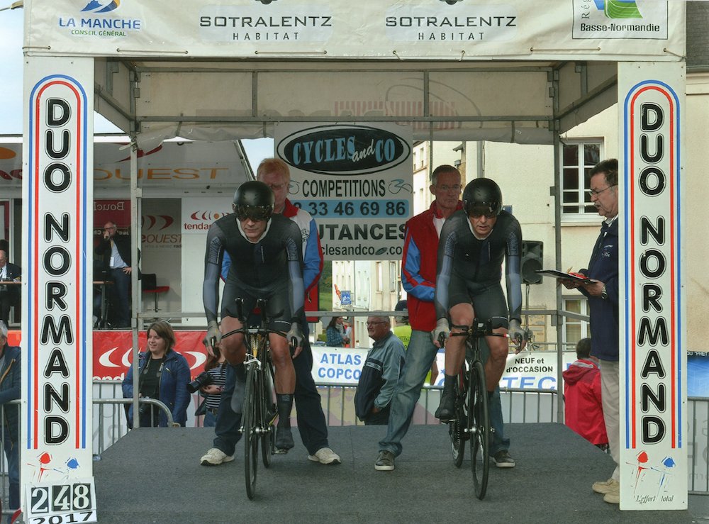 Team Grumpy once again regrouped for another ride, our 14th, at the Duo Normand, the well-known 2-up time trial run each year in late September in Marigny. Nowadays, we generally only ride two 2-ups each year, the Port Talbot Wheelers 2-up '25' in early March and the Duo Normand itself. And with advancing years and work pressures which draw us from training, our performances might be expected to dip over the years.