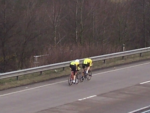After a quick return to the car to ditch our jackets etc, we rolled off to the start. Unfortunately we both suffered computer problems - in my case I lost all speed input just after the start, so the timer cut out for a period. This made it a little difficult to gauge our progress. The first half of the event, on the dual carriageway, was relatively straightforward, and we fell easily into out usual 2-up strategy of frequent changes. The photo below was taken on the return leg on the dual carriageway, from an overhead walkway. It shows us in our usual tight formation (with me on the back).